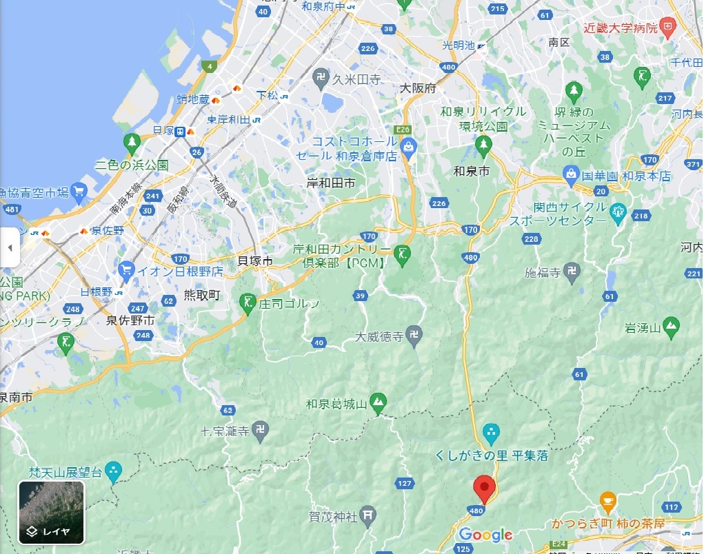 大阪側から480号線の片側1車線ずつ道をひたすら南下 24号線にぶつかる少し前にあります。平日はトラックが多いですが、曲がりくねった道はなく走りやすいです。
